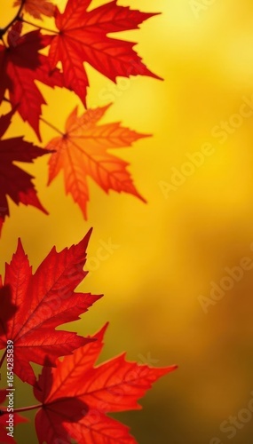 Fototapeta premium Crisp, red and gold autumn leaves against a sunny yellow background , maple,...