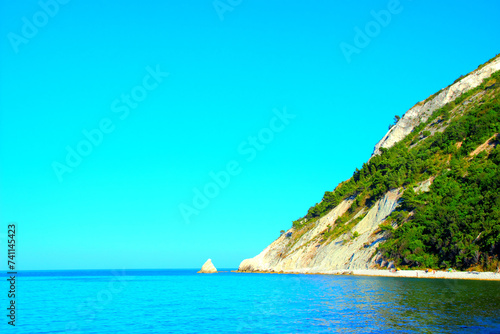 Fototapeta premium Crisp scenery with Mount Conero and Scoglio della Vela, the sail-shaped rocky formation rising from a bed of candid Adriatic Sea waters, azure, emerald, sparkling and mirroring, under a clear sky