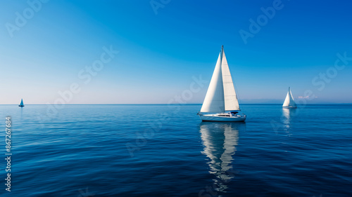 Fototapeta premium Crisp white sailboats gliding over deep blue ocean waters under a cloudless...