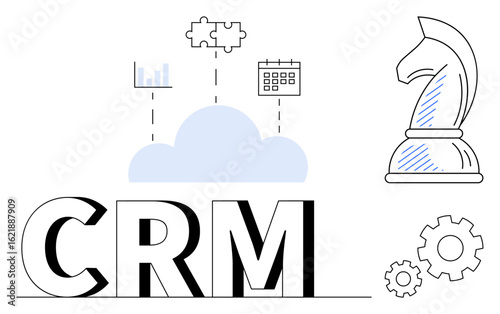 Fototapeta premium CRM text with cloud connected to puzzle, bar graph, and calendar. Knight and gears represent strategy and operations. Ideal for business planning, management, CRM tools, strategy, data and teamwork