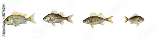 © The 2R Artificiality, Fototapeta premium Croaker Fish Illustration Isolated on Transparent Background Multiple Poses Side View Detailed Features and Coloration of Each Fish Variant