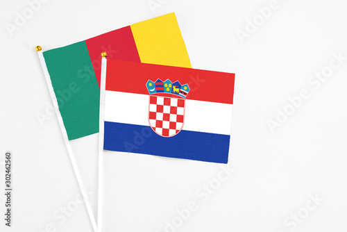 © sezerozger, Naklejka premium Croatia and Cameroon stick flags on white background. High quality fabric, miniature national flag. Peaceful global concept.White floor for copy space.
