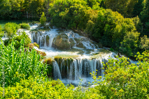 © Stefano, Obraz premium Croatia, Dalmatia, Krka National Park - 20 August 2024 - Top view of an amazing waterfall at Krka national park