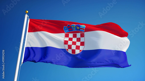 © railwayfx, Naklejka premium Croatia flag waving against clean blue sky, close up, isolated with clipping path mask alpha channel transparency