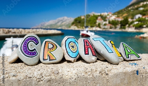 © pixel_dreams, Naklejka premium Croatia name painted on the stones, boat in marina in background