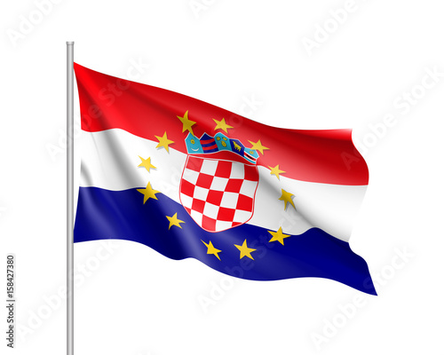 Naklejka premium Croatia national waving flag with a circle of European Union twelve gold stars, political and economic union with EU, member since 1 July 2013. Realistic vector illustration
