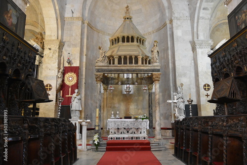 © Albin Marciniak, Fototapeta premium Croatia, Trogir, old city, heritage, St. Lawrence's Cathedral, a Romanesque-Gothic structure from the beginning of the 13th century, with a bell tower, accessible to tourists.