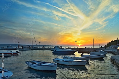 © bikemp, Fototapeta premium Croatia-view of a the harbor in town Starigrad at sunset