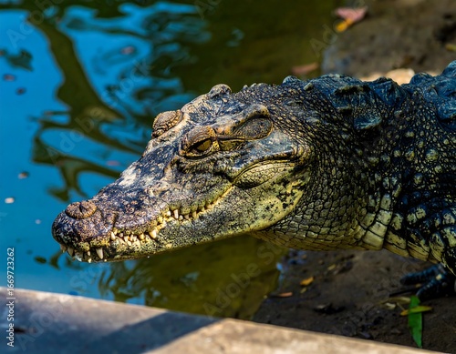 © Banyu, Obraz premium Croc head by water