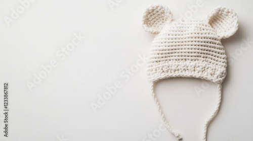 Fototapeta premium Crochet Ear Hat on Soft White Background with Copyspace for Text or...