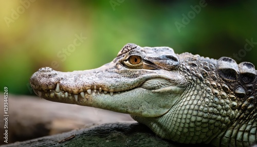 © netsay, Obraz premium Crocodile Basking in the Sun Majestic Reptile Overlooking a Lush Wetland at Dawn, with Rich Textures and Vibrant Greens Prevailing, Capturing the Serene Beauty of a Remote Wildlife Haven.