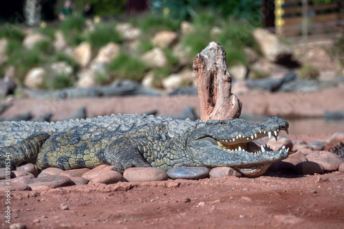 © ako-photography, Fototapeta premium Crocodile basking on rocky shore in Morocco during sunny afternoon