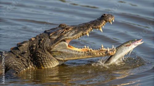 © Normal Desing, Obraz premium Crocodile hunts and eats fish in freshwater habitat wildlife documentary perspective