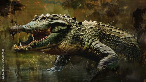 Fototapeta premium Crocodile in murky water with artistic brushstrokes.