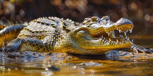 Fototapeta premium Crocodile lounging in the sunlight with its mouth wide open.