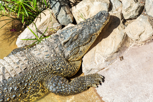 Fototapeta premium Crocodile on the shore basking in the sun, close-up