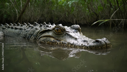 Fototapeta premium Crocodile partially submerged in river with eyes and snout visible surrounded by mangroves