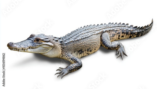 © Anastasiia, Naklejka premium Crocodile resting on a white background, showcasing its detailed textures and colors