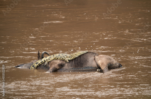 © Dr Ajay Kumar Singh, Fototapeta premium Crocodile resting on the carcass of Wildebeest