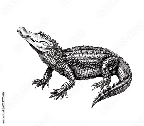 © Maksim, Fototapeta premium Crocodile sketch, alligator etching isolated illustration. Black and white animal drawing