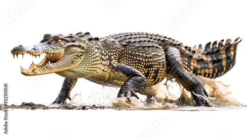 © Tracto, Fototapeta premium Crocodile snapping its jaws at a passing animal near the water's edge, white background for clipping