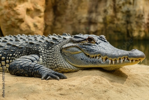 © Rashidi, Fototapeta premium Crocodile Sunbathing on Riverbank in Natural Habitat