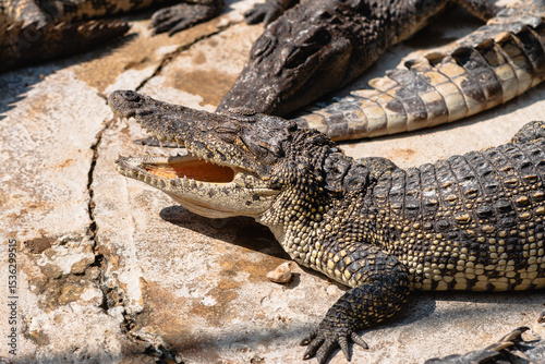 Fototapeta premium Crocodile sunbathing wildlife reserve animal natural habitat close-up reptile...