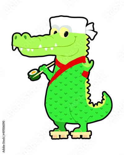 Naklejka premium Crocodile sushi chef holding roll with chopsticks