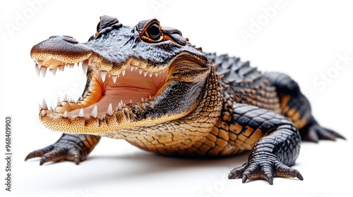 © sa-photo, Naklejka premium Crocodile with its mouth open on a white background, showing sharp teeth