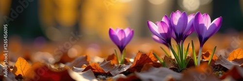© Sathaporn Buarabut, Fototapeta premium Crocus blooms against a backdrop of autumn leaves, crocus, petals, bloom