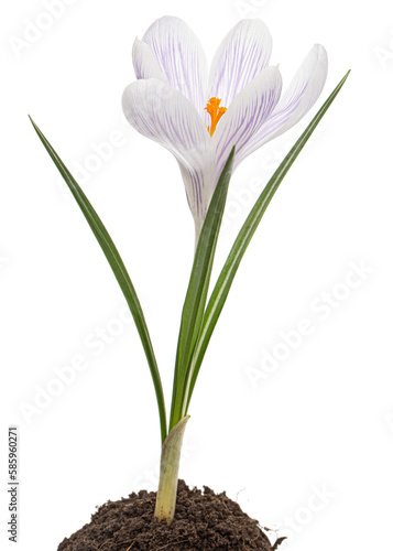 Fototapeta premium Crocus flower growing from the ground, isolated on white background