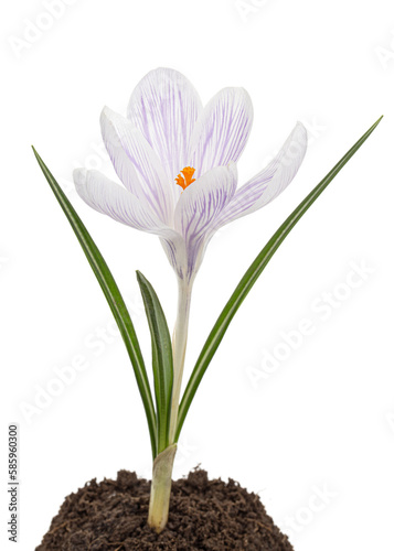 Fototapeta premium Crocus flower growing from the ground, isolated on white background