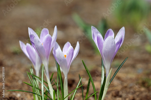 Fototapeta premium Crocus flowers bloom in the spring garden. Saffron in sunny day
