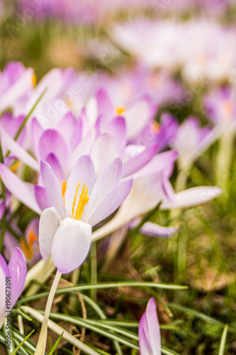 Fototapeta premium Crocus, plural crocuses or croci is a genus of flowering plants in the iris family. A single crocus, a bunch of crocuses, a meadow full of crocuses, close-up crocus,