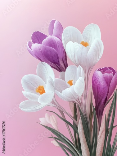 © Johannes, Fototapeta premium Crocuses pink and white spring flowers on pastel pink background.