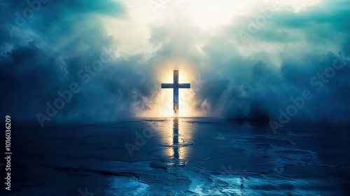 Naklejka premium croix catholique lumineuse au milieu de la brume