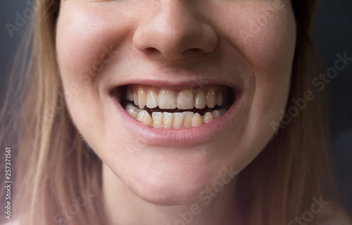 Obraz premium Crooked teeth in the woman's mouth. Dental decay and bad smile. Dentist treatment concept.