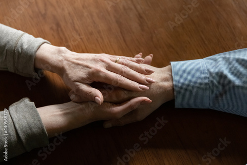 Fototapeta premium Crop close up of mature woman hold old husband hand show love and care in relationships. Attentive middle-aged wife comfort caress support senior man spouse, feel supportive. Family unity concept.