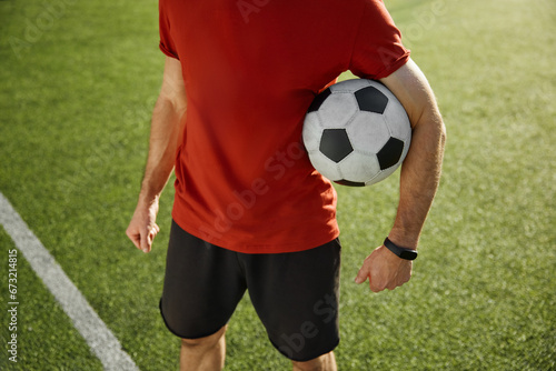 Fototapeta premium Crop view of football trainer or soccer player holding ball