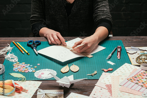 Obraz premium cropped image of designer cutting paper for scrapbooking greeting postcards