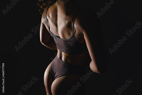 Naklejka premium Cropped image of female body, muscular back, buttocks. Model standing in...