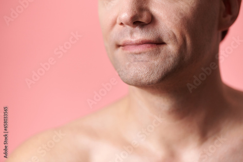 © DragonImages, Fototapeta premium Cropped image of smiling shaved mature man standing against pink background