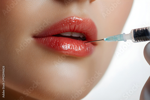 Obraz premium Cropped macro of a young woman getting fillers injection in her lips....