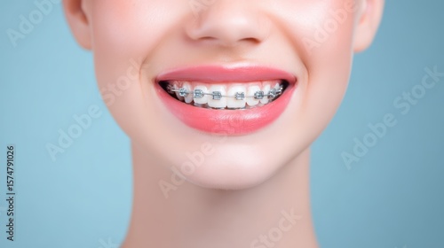 © Paradox, Fototapeta premium Cropped portrait of young woman smiling with dental braces showing natural beauty and healthy teeth orthodontic treatment concept for dental care hygiene medicine and modern healthcare promotion