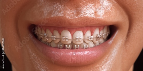© Paradox, Fototapeta premium Cropped portrait of young woman smiling with dental braces showing natural beauty and healthy teeth orthodontic treatment concept for dental care hygiene medicine and modern healthcare promotion