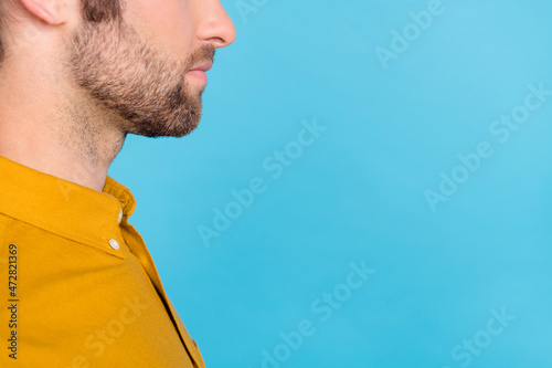 © deagreez, Obraz premium Cropped profile photo of chin young beard guy near empty space wear yellow shirt isolated on blue color background