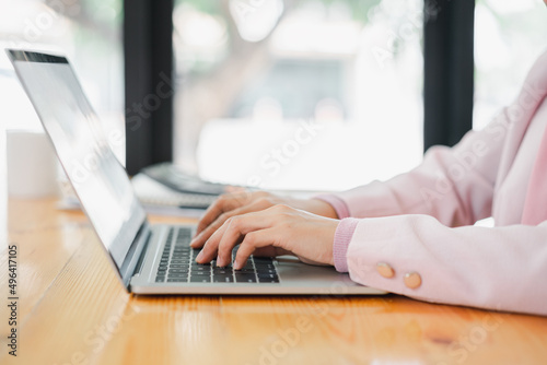 © kenchiro168, Fototapeta premium Cropped shot of businesswoman working,typing on tablet computer. Selective focus,Soft focus.