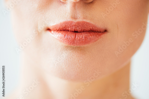 Obraz premium cropped view of herpes on lips of woman isolated on white