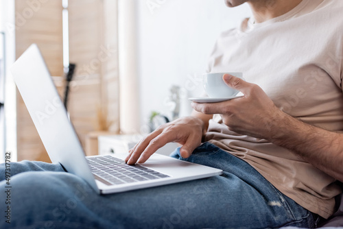 Naklejka premium cropped view of man holding cup of coffee while using laptop in bedroom.