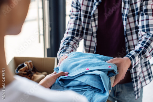Fototapeta premium cropped view of man taking clothes from african american volunteer